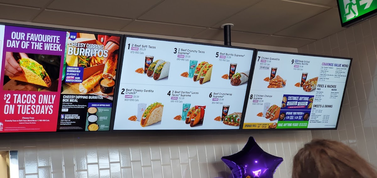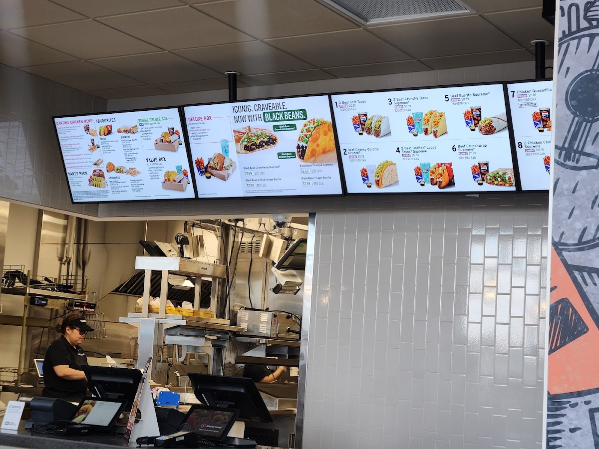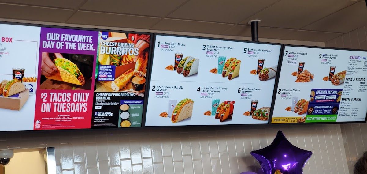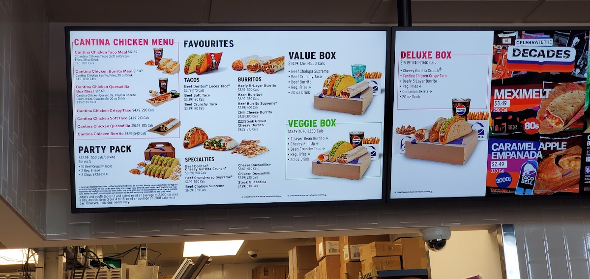 Taco Bell at Medicine Hat offers a vibrant take on Mexican fast food with a diverse menu that caters to various tastes, including vegetarian options. Known for its signature SlowRoasted Cantina® Chicken tacos—both soft and crispy—each features tender chicken, fresh lettuce, purple cabbage, pico de gallo, cheddar cheese, and creamy Avocado Ranch sauce. Their Cantina Chicken Combo stands out, served with golden Nacho Fries and a rich Nacho Cheese sauce, paired perfectly with a refreshing 20 oz soft drink like Mountain Dew® Baja Blast® or Dr Pepper®.